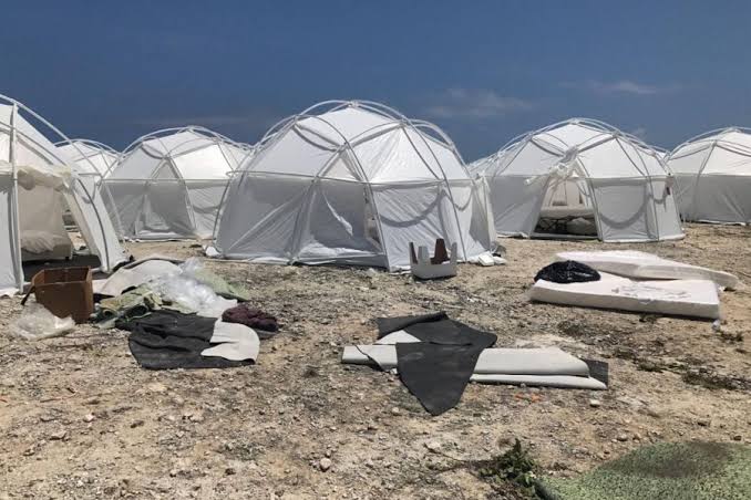 menunggu sembari minum sementara di lokasi Fyre Festival, panitia