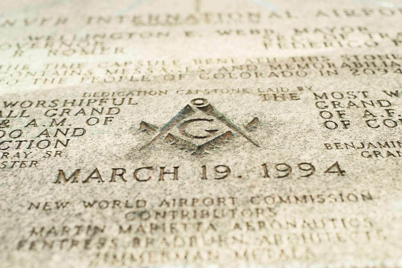 Jika kalian berkunjung ke Jeppeson Terminal di pintu masuk selatan DIA, maka kalian akan menemukan plakat mengejutkan ini. Plakat tertanda 19 Maret 1994 merupakan plakat penghormatan bagi yang berjasa dalam pembangunan bandara ini, namun jika kalian jeli, kalian akan melihat lambang sebuah organisasi yang kerap diidentikkan dengan Teori Konspirasi, yakni Freemason. Bahkan, lambang Freemason yang terdiri atas jangka dan buku yang terbuka tersebut (melambangkan “pengetahuan”) tak malu-malu terpampang jelas di bagian tengah plakat tersebut. Tentu, hal ini mengundang spekulasi, apakah Freemason merupakan salah satu penyumbang dana bagi pembangunan bandara ini? Dan tentunya pertanyaan paling menggelitik, apakah imbalan yang akan mereka dapatkan dari donasinya tersebut?